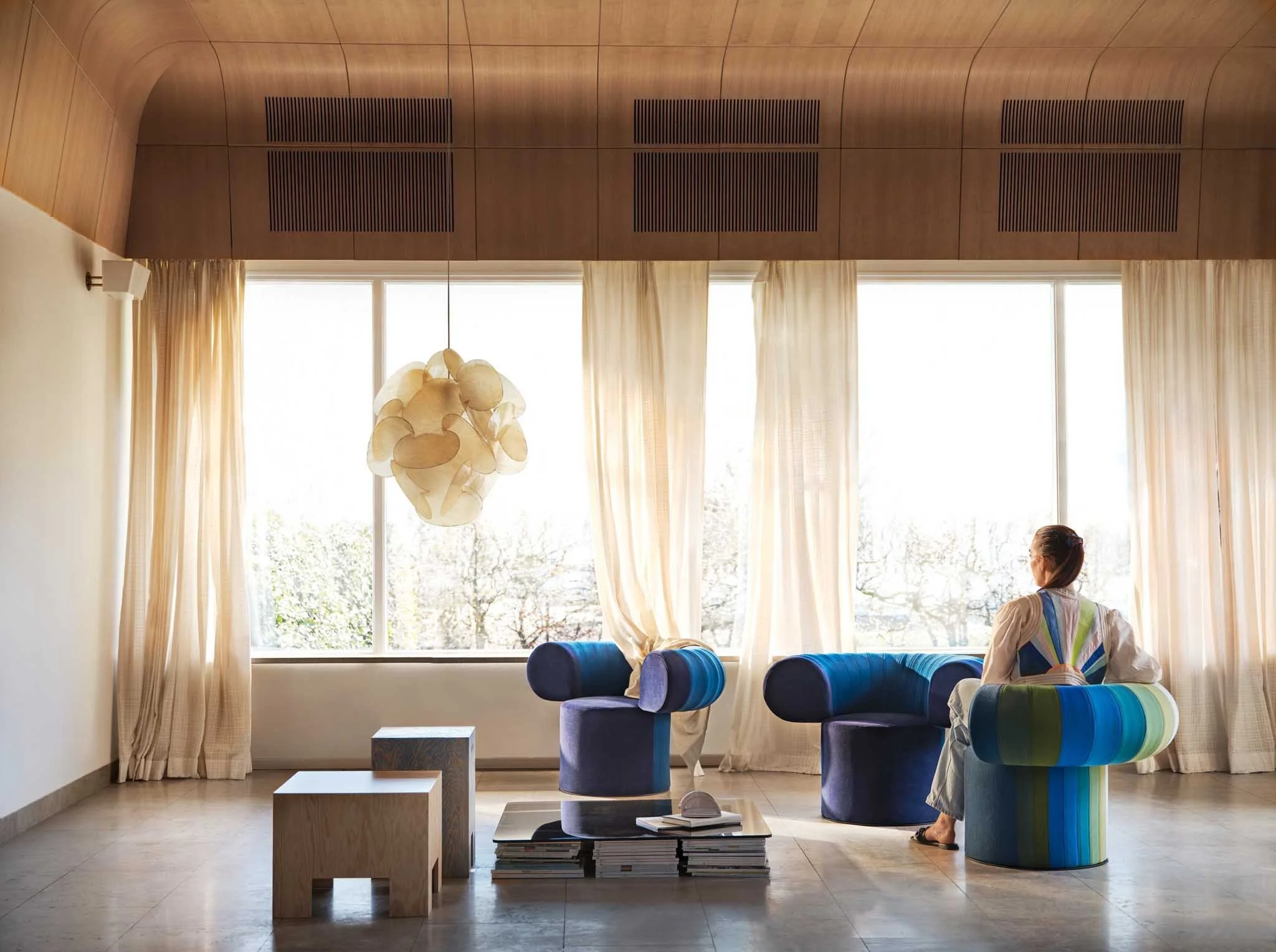 The inviting, circular throne redefines the art of lounging. Designed to stand alone or grouped together – Big Talk offers a range of sophisticated pairings to accommodate a variety of interior spaces. When joined, the lounge chairs create a modular loveseat in a beautiful, undulating spectrum of colorful bands. Snaking around in an intriguing design arrangement, both the seat and backrest are shaped out of molded foam and offered in various color pairings. Designed by furniture designer Adam Goodrum, the piece was inspired by textile swatches and the fanning blocks of color created when sampling.